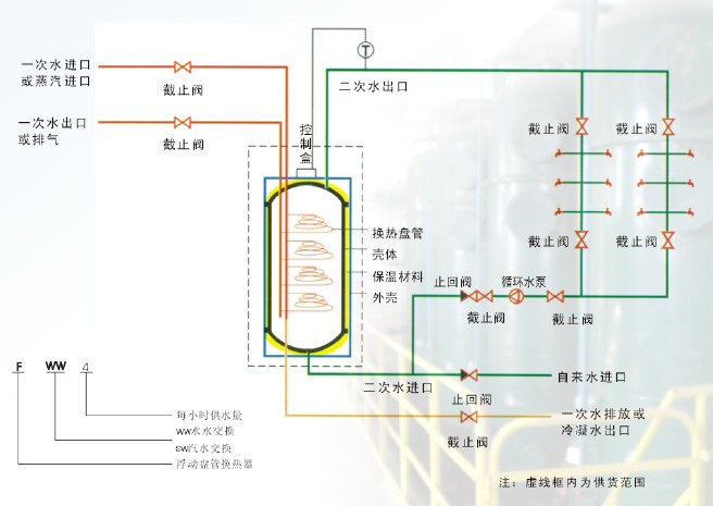 6、浮動盤管式換熱器采用分水立管、集水立管中置型。