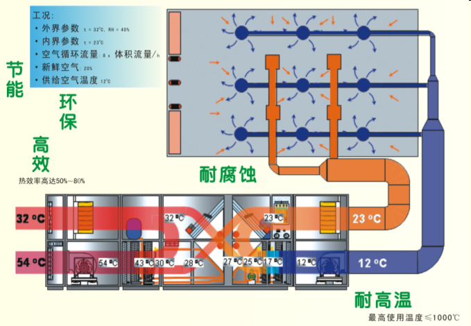 節(jié)能效益好,由于采用耐腐蝕或不銹鋼等材料,氣—氣換熱器熱效率高達50%~80%,最高使用溫度可達1000℃。